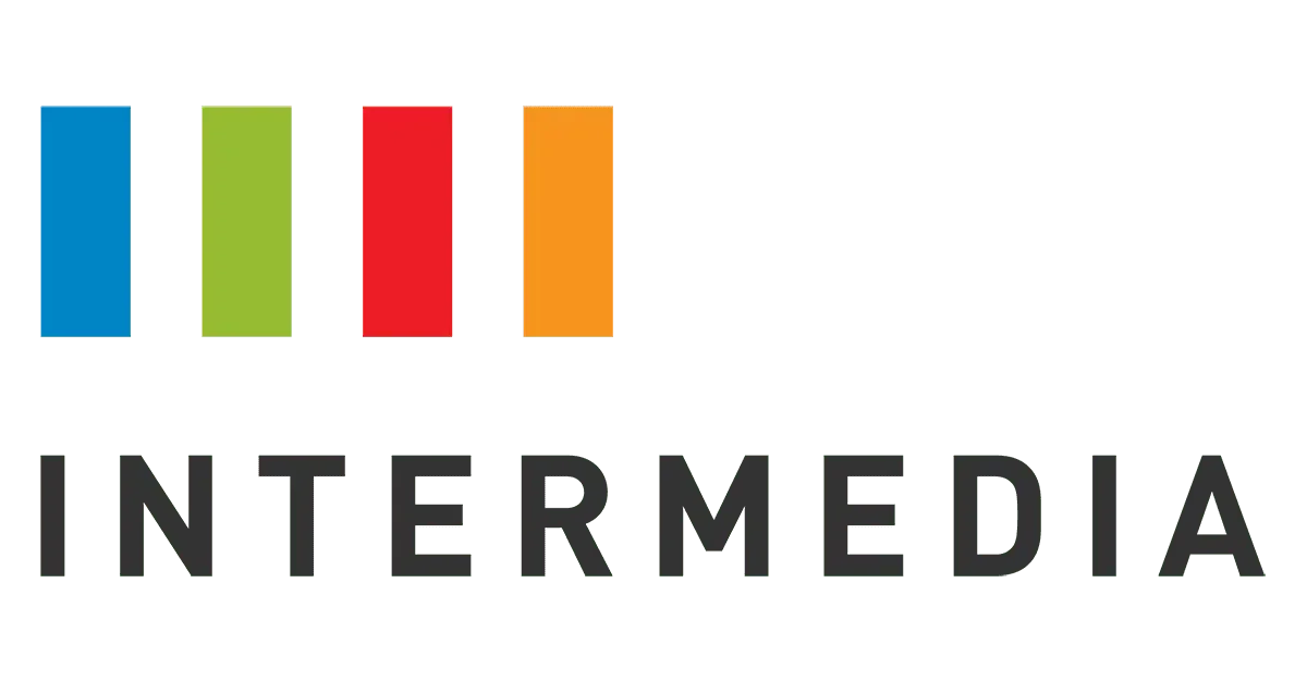 Logo with five vertical color bars in blue, green, red, brown, and orange above the word "INTERMEDIA" in black text.